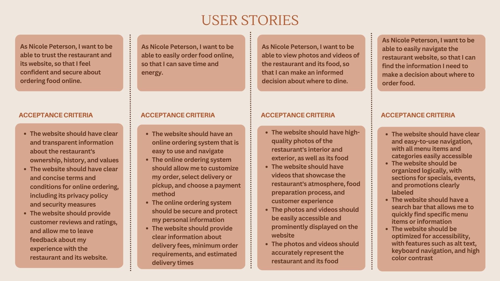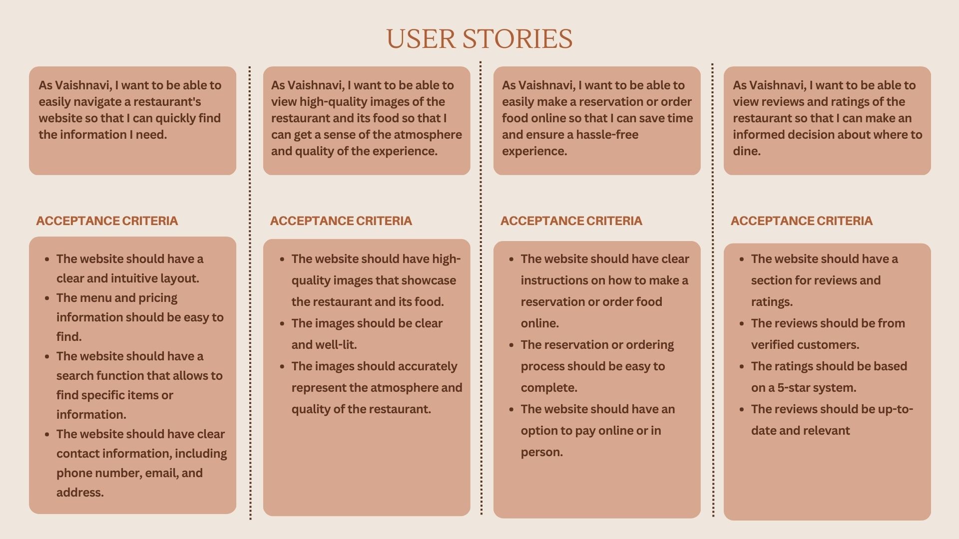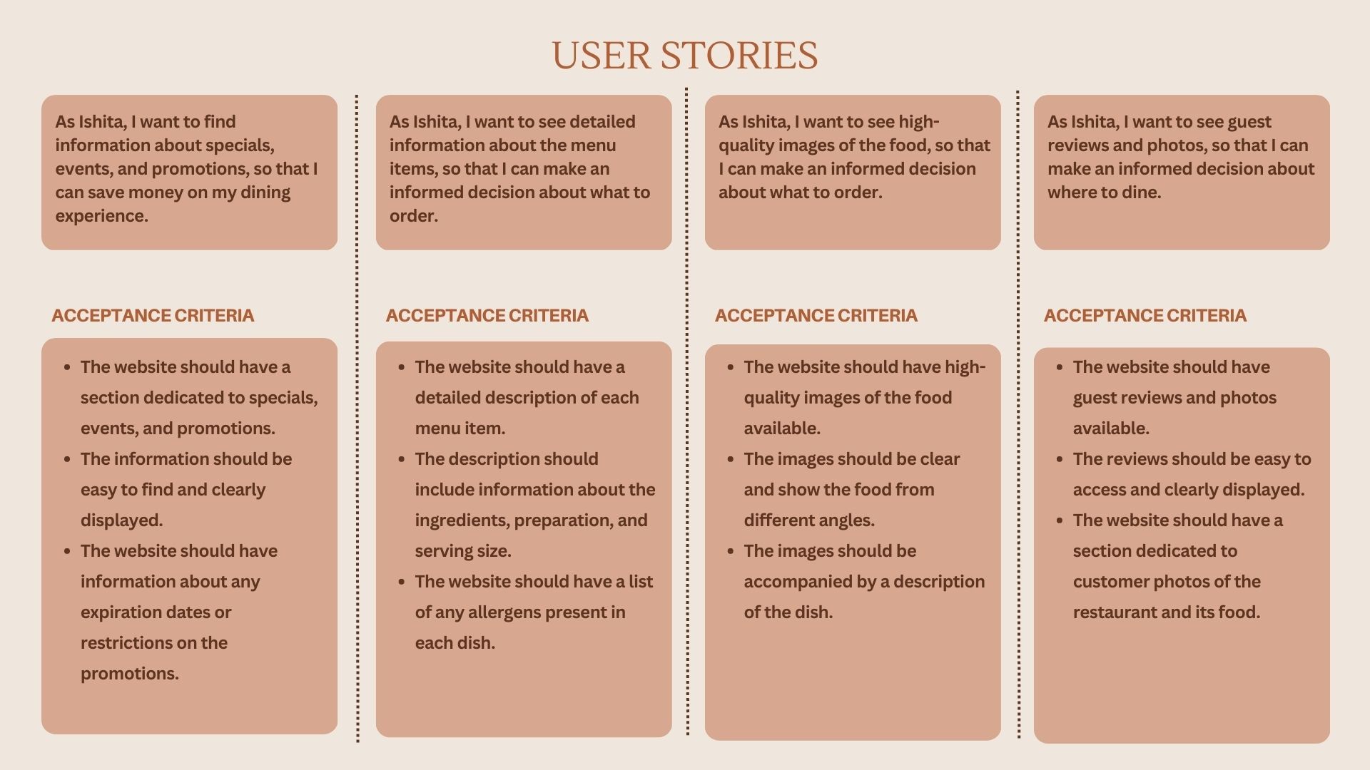 By analyzing the information gathered from user questionnaires and creating personas, a series of user stories were formulated to gain a deeper understanding of the user experience on the India cafe website. These user stories aim to capture the various stages and interactions users go through during their journey on the website.